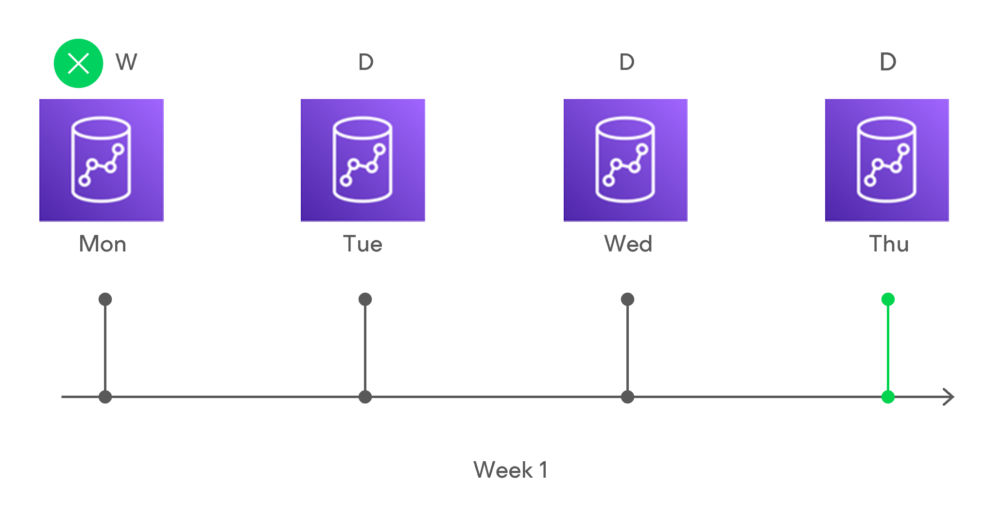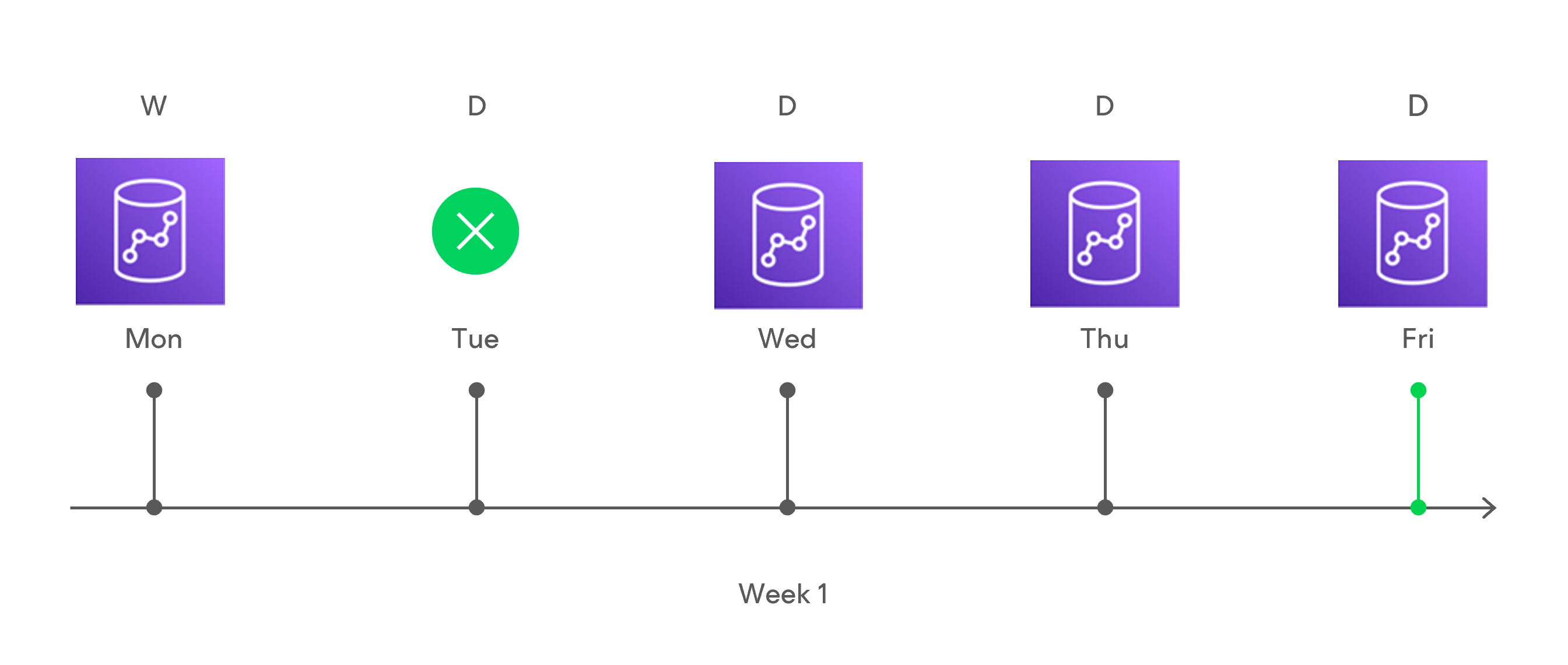 - Veeam Backup for AWS will continue creating restore points for the next week in the same way as described in steps 1–4.