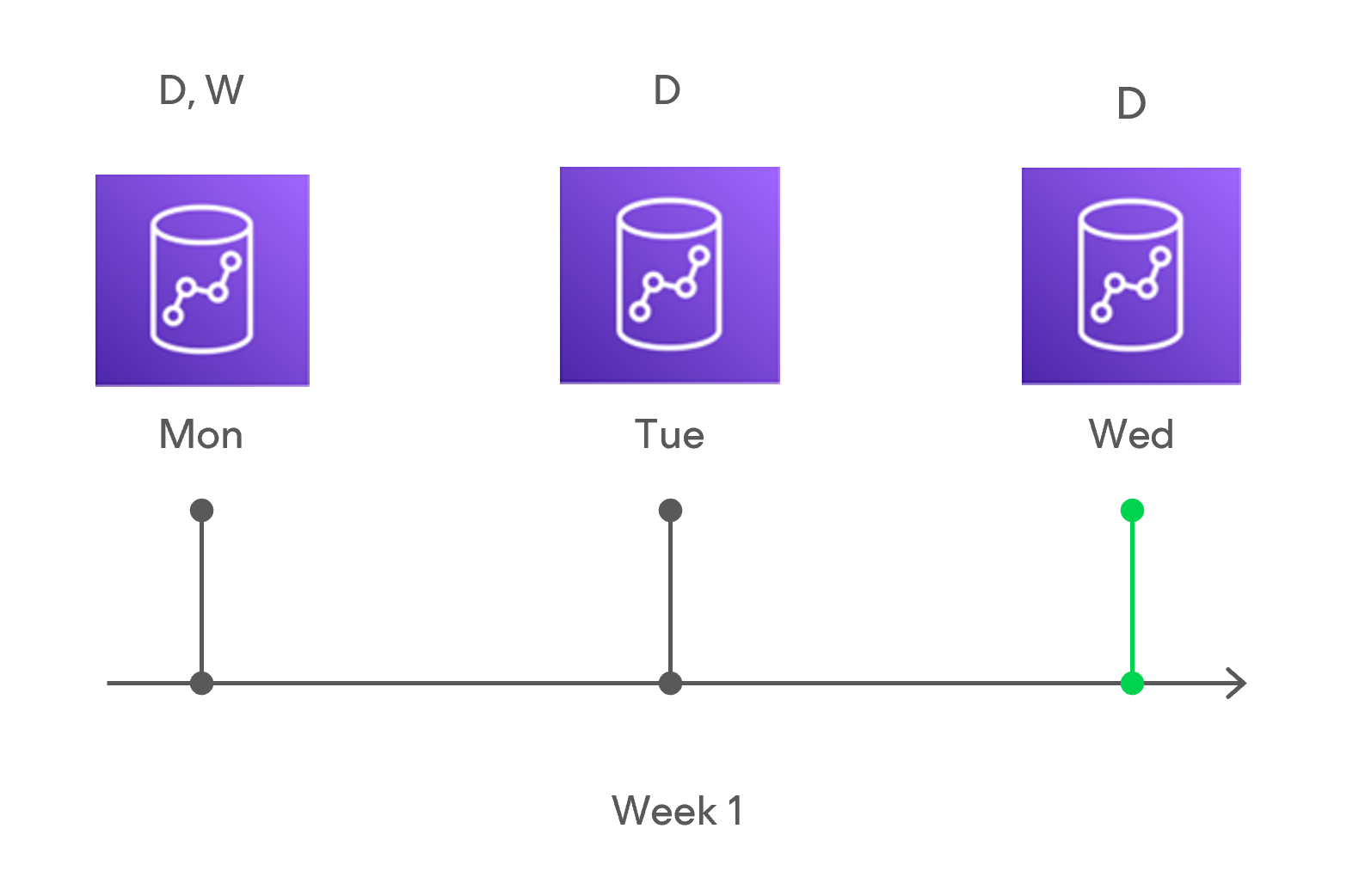 Since 7:00 AM, Monday is specified in weekly scheduling settings, Veeam Backup for AWS will also assign the (W) flag to this restore point. As a result, 2 flags (D,W) will be assigned to the restore point.