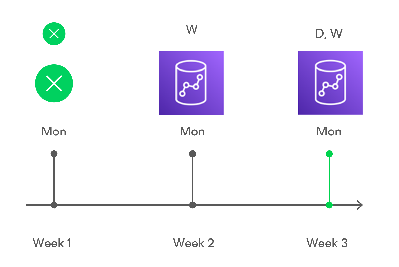 - On week 3, after a backup session runs at 7:00 AM on Monday, the earliest weekly restore point in the backup chain will get older than the specified retention limit. Veeam Backup for AWS will unassign the (W) flag from the earliest weekly restore point. Since no other flags are assigned to this restore point, Veeam Backup for AWS will remove this restore point from the backup chain.