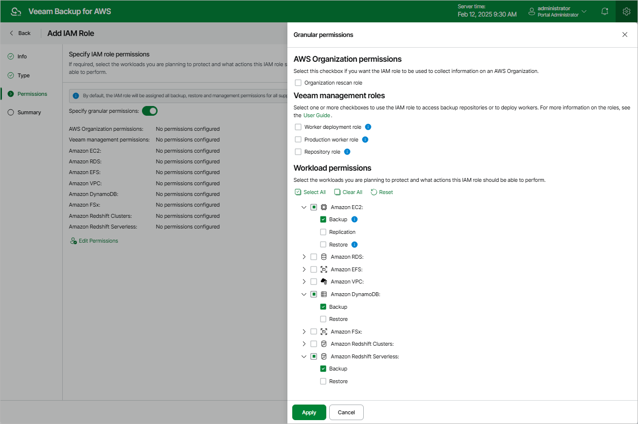 - Backup — Veeam Backup for AWS will protect EC2, Redshift, DynamoDB, EFS, FSx and VPC resources. If you select this operation for an IAM role, you will be able to select it in the EC2 backup, Redshift backup, Redshift Serverless backup, DynamoDB backup, EFS backup, FSx backup and VPC configuration backup settings.