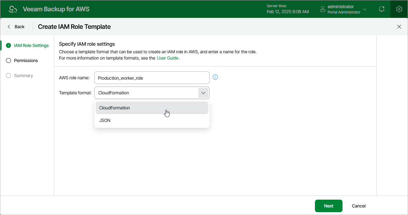 - Select the CloudFormation option to export the created template to a .CFORM file. You can further upload the file to the CloudFormation service and use it to create the necessary IAM role automatically, as described in AWS Documentation.