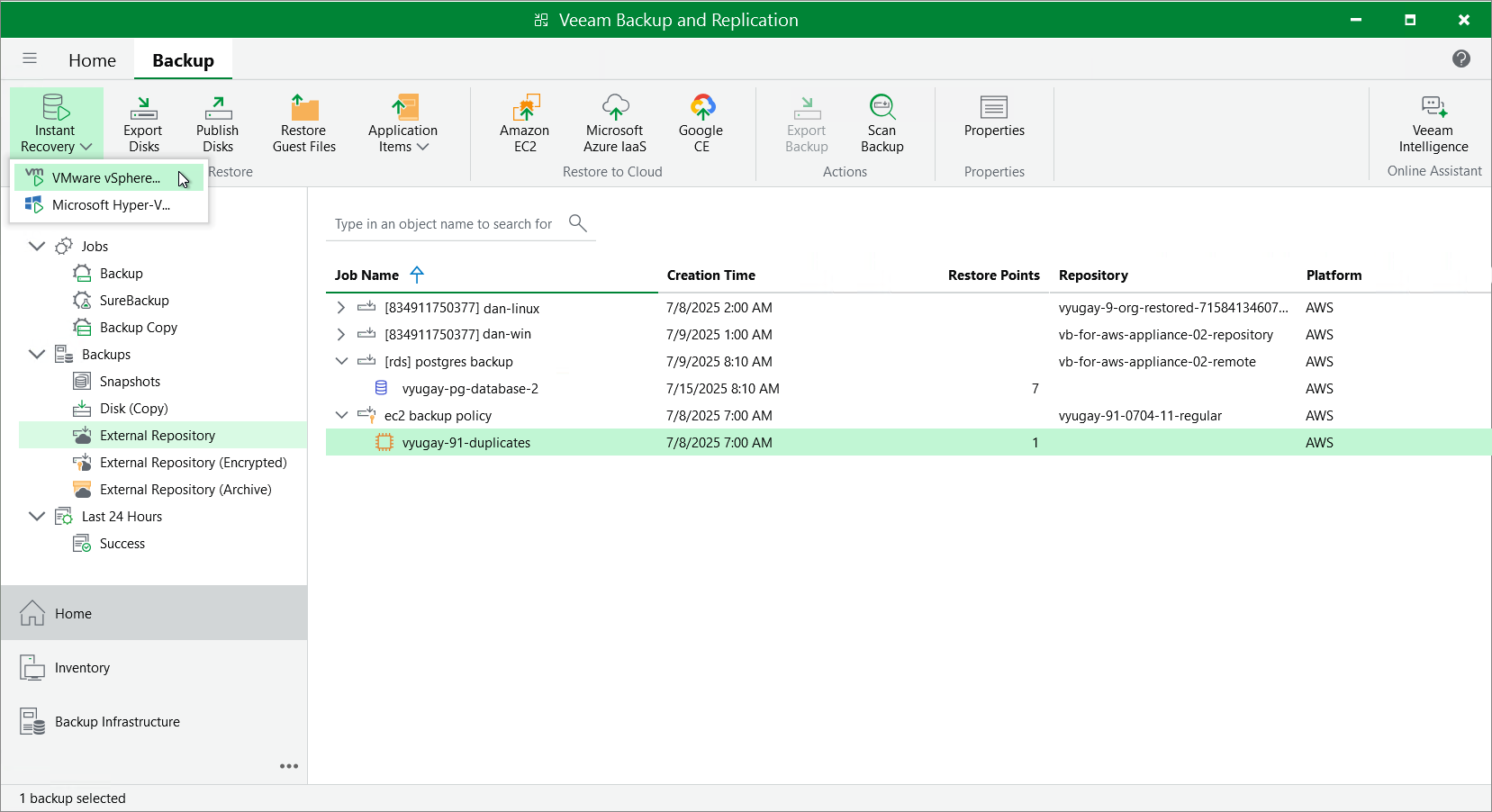 - Expand the backup policy that protects an EC2 instance that you want to recover, select the necessary EC2 instance and click Instant Recovery on the ribbon.