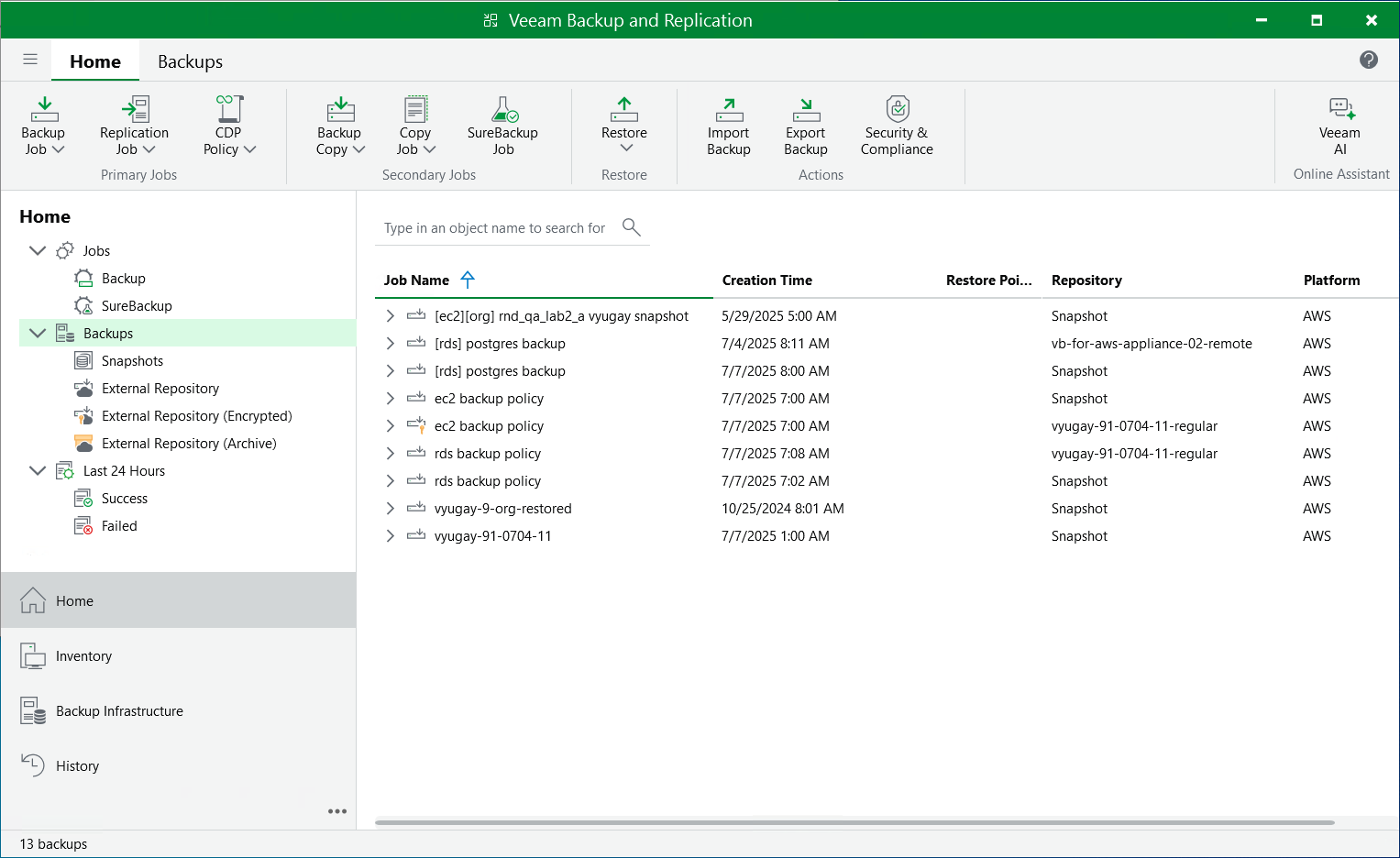 To view and manage backed-up data, navigate to the Backups node of the Home view. The node displays information on all restore points created by backup appliances.