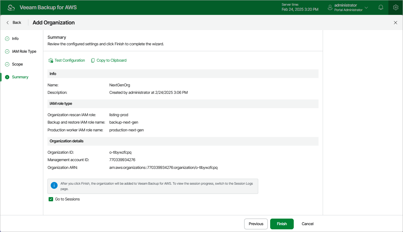 After the required permissions are granted, close the Test policy configuration window and review configuration information. Then, choose whether you want to proceed to the Session Log page to track the progress of adding the organization, and click Finish.