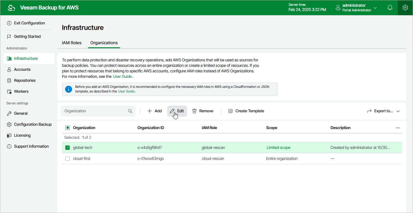 For each AWS Organization added to Veeam Backup for AWS, you can modify settings configured while adding the organization: