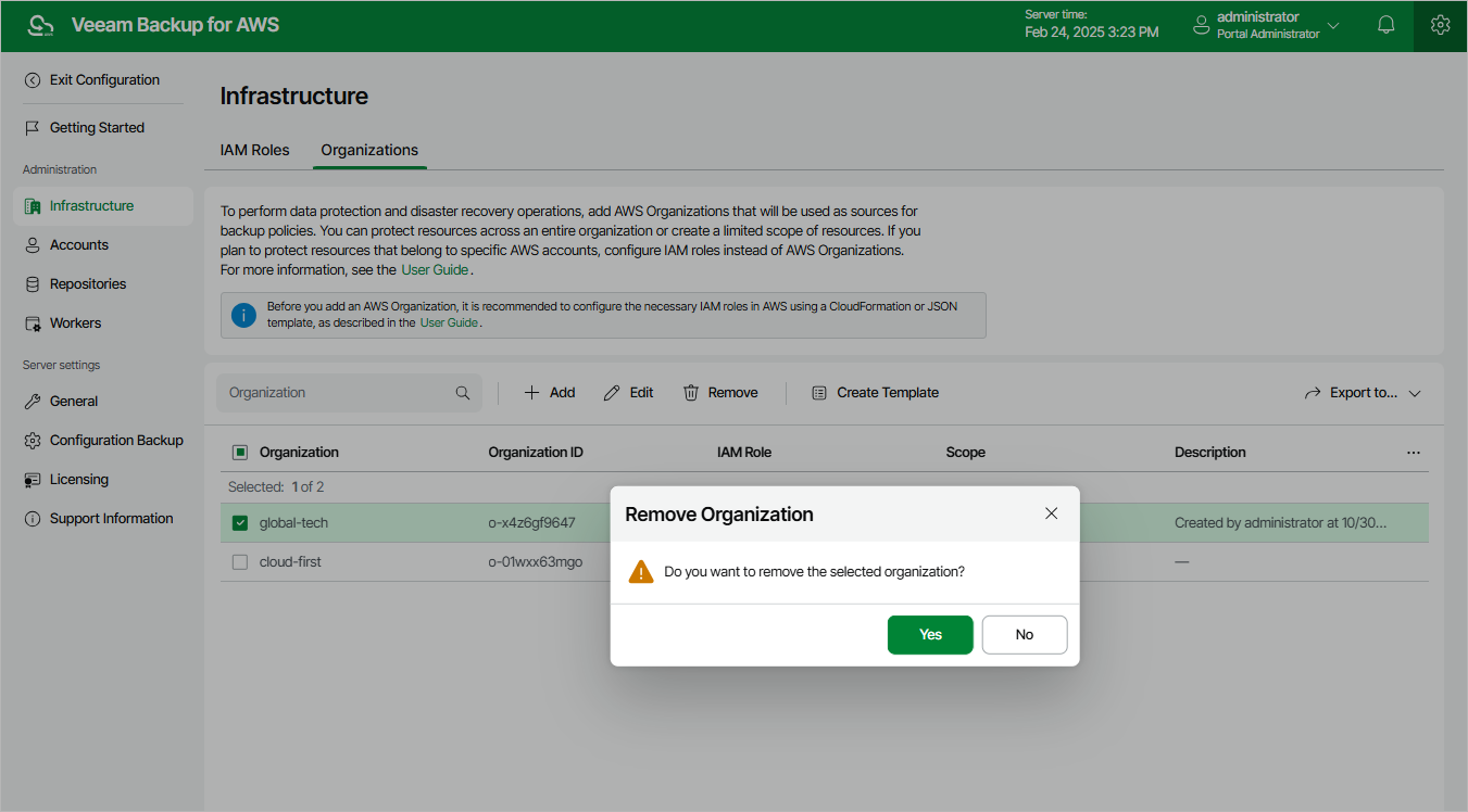 Veeam Backup for AWS allows you to permanently remove an AWS Organization from the configuration database if you no longer need it: