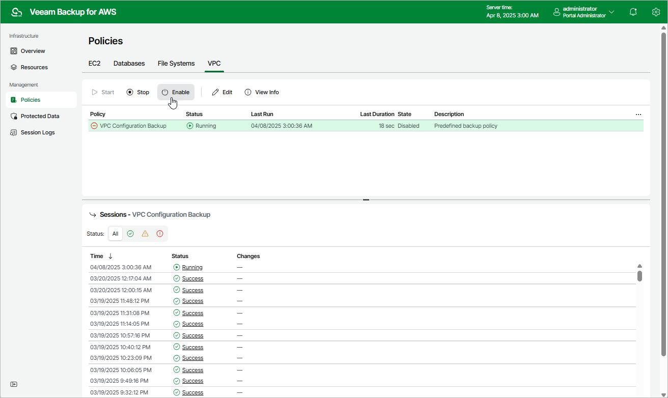 By default, Veeam Backup for AWS comes with the disabled VPC Configuration Backup Policy. You can manually start or enable the disabled backup policy at any time you need.