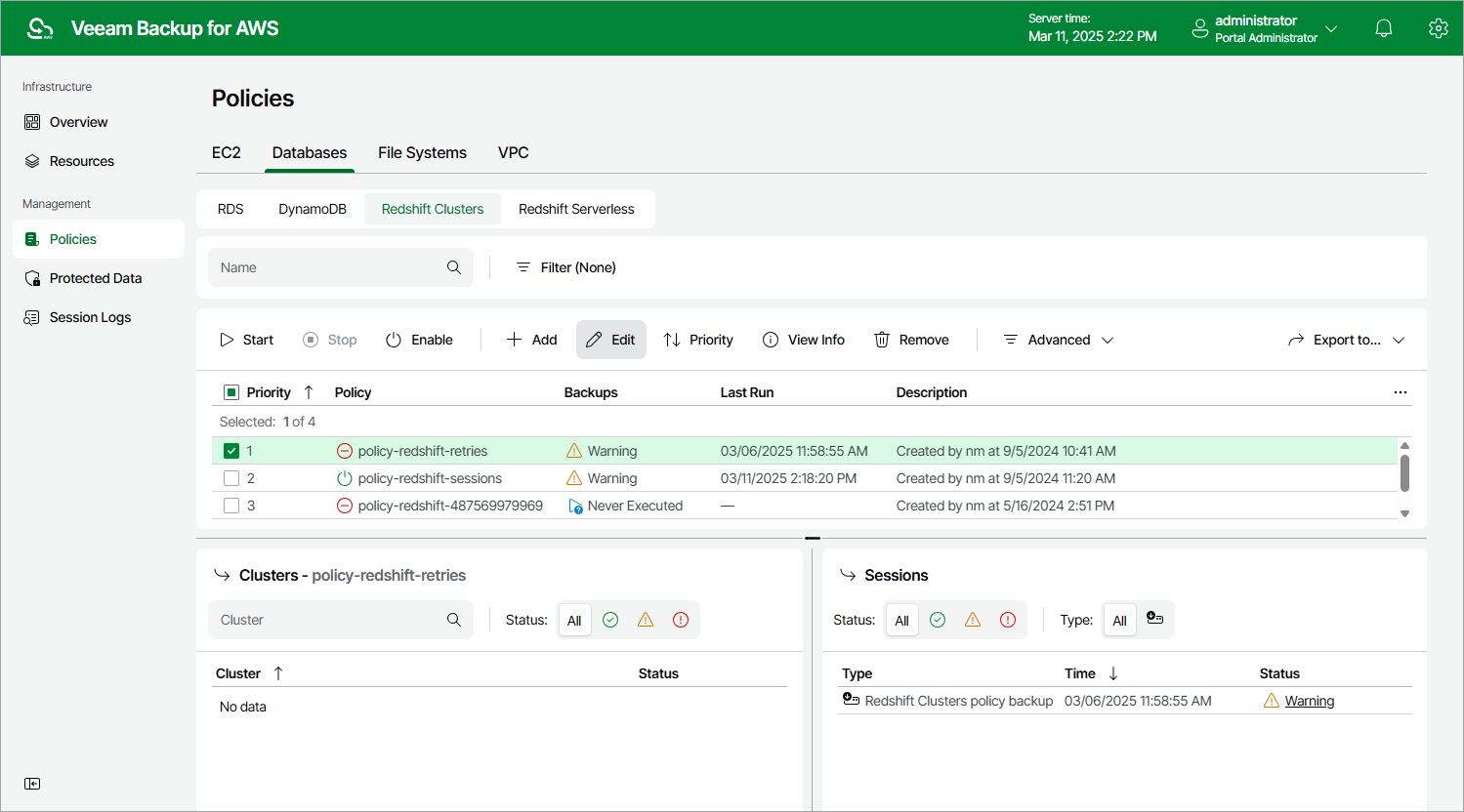 - Switch to the necessary tab and select the backup policy whose settings you want to edit.