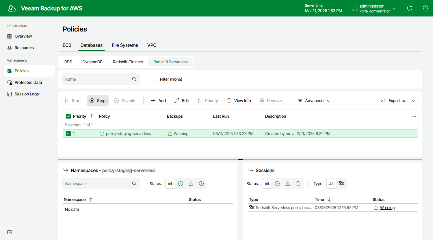 You can start a backup policy manually, for example, if you want to create an additional restore point in the snapshot or backup chain and do not want to modify the configured backup policy schedule. You can also stop a backup policy if processing of an instance is about to take too long, and you do not want the policy to have an impact on the production environment during business hours.