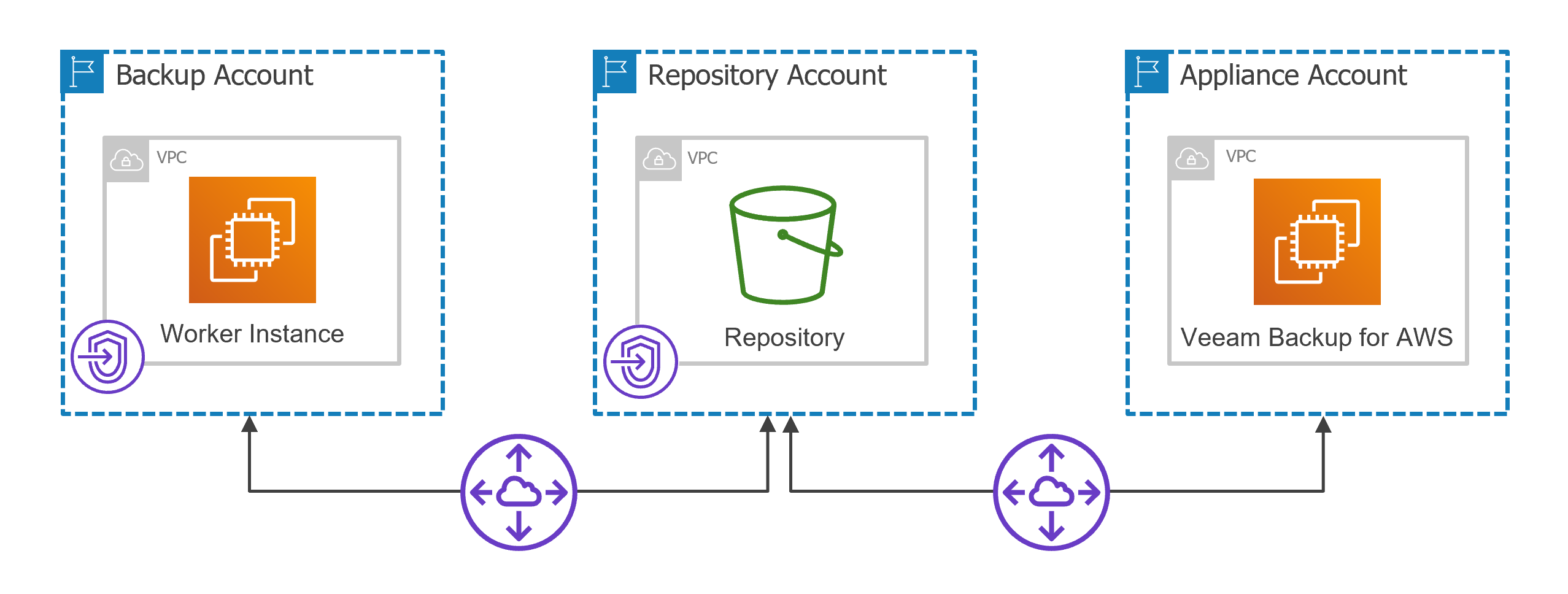 This is an archive version of the document. To get the most up-to-date information, see the current version. Configuring Private Networks for Backup Account For Veeam Backup for AWS to be able to deploy worker instances in a private environment in the backup account, perform the following steps:Create VPC interface and S3 interface endpoints for subnets to which worker instances will be connected.Create a peering connection between VPCs.Add routes to the route tables associated with the subnets of the VPCs.