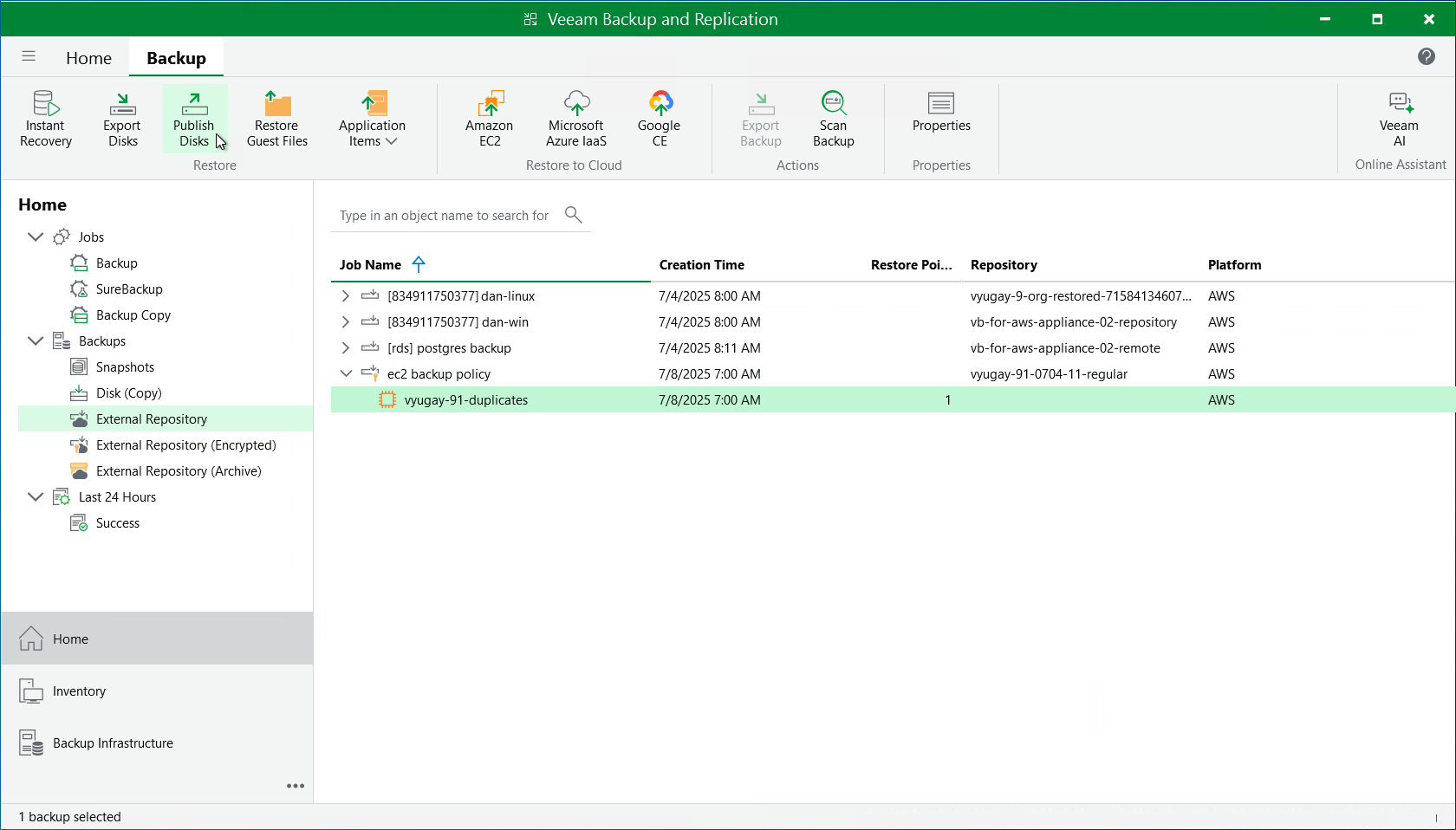 - Expand the necessary backup policy, select the EC2 instance whose volumes you want to publish and click Publish Disks on the ribbon.