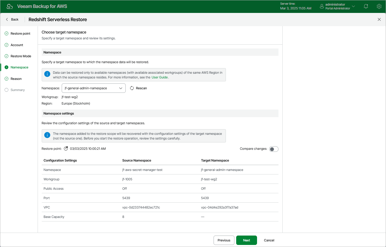 At the Namespace step of the wizard, specify a namespace to which the backed-up data will be restored. To help you choose a namespace, Veeam Backup for AWS provides configuration settings on each available namespace.