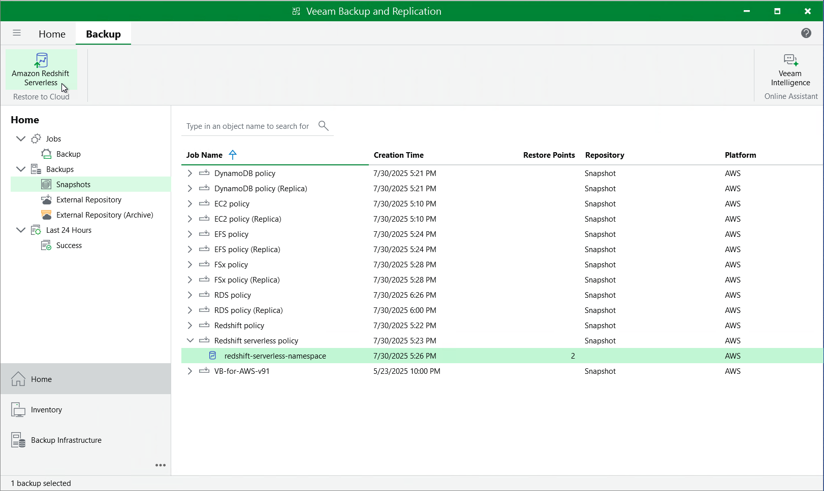 You can recover corrupted Redshift Serverless namespaces in the Veeam Backup for AWS Web UI only. However, you can launch the Redshift Serverless Restore wizard directly from the Veeam Backup & Replication console to start the restore operation: