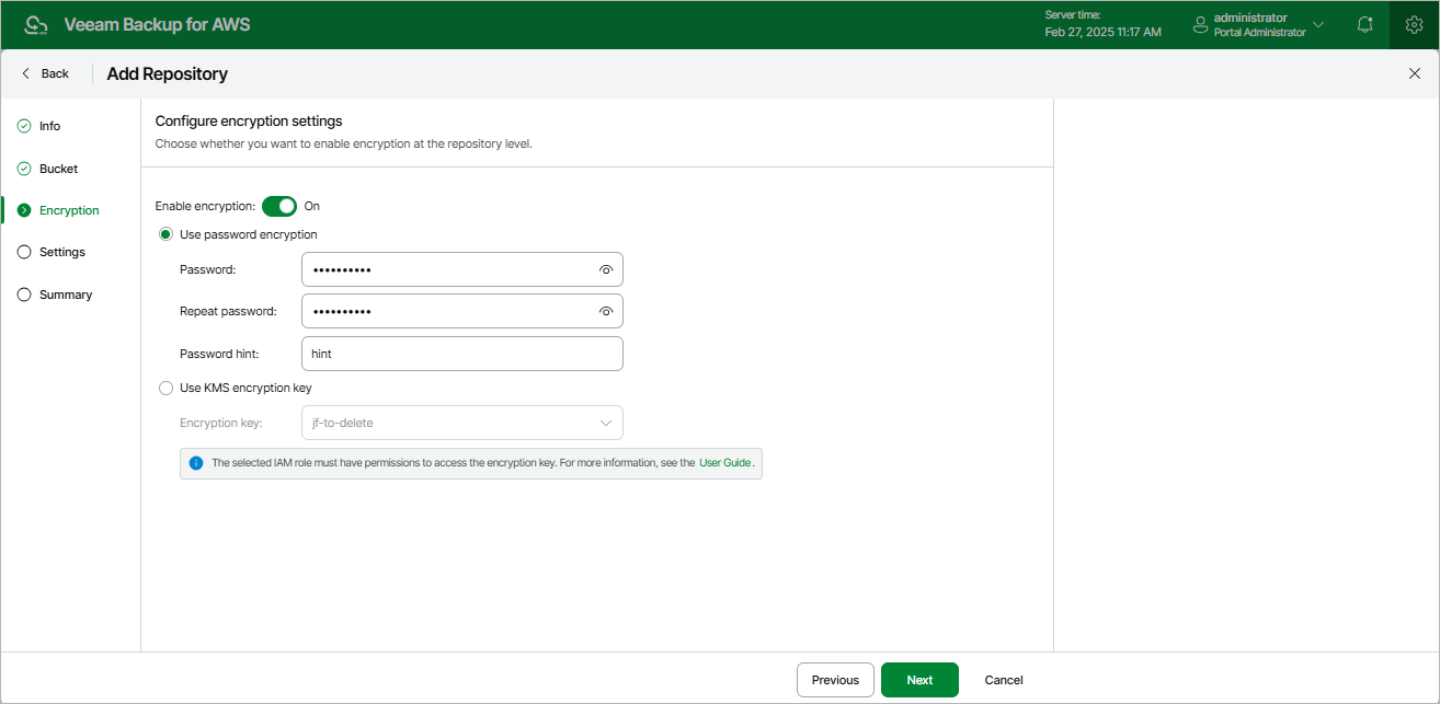 - Choose whether you want to use a password or an AWS Key Management Service (KMS) key to encrypt the backed-up data. For more information on encryption algorithms, see Backup Repository Encryption.