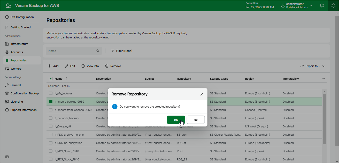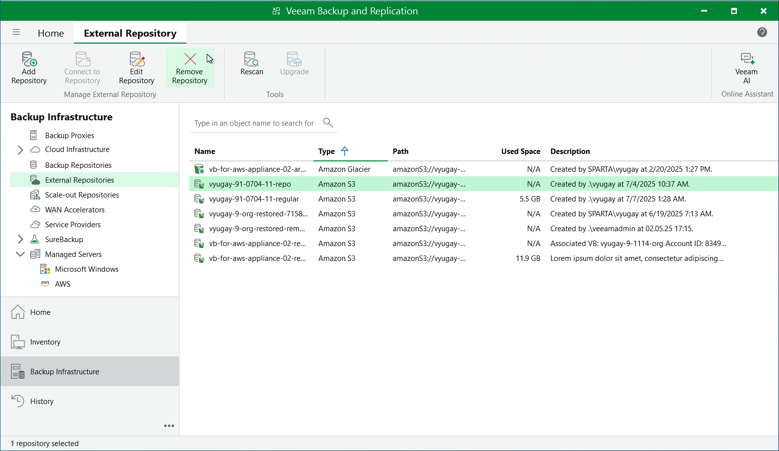 AWS Plug-in for Veeam Backup & Replication allows you to permanently remove repositories from the backup infrastructure: