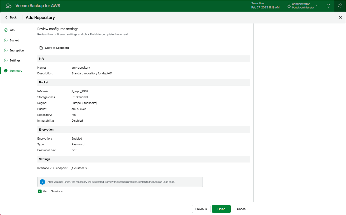 At the Summary step of the wizard, review summary information, choose whether you want to proceed to the Session Log page to track the progress of repository creation, and click Finish.