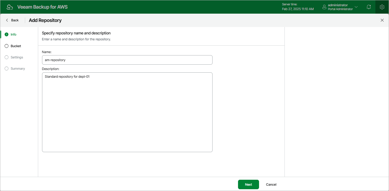 At the Info step of the wizard, use the Name and Description fields to enter a name for the new backup repository and to provide a description for future reference. The name must be unique in Veeam Backup for AWS; the maximum length of the name is 125 characters; the maximum length of the description is 1024 characters.