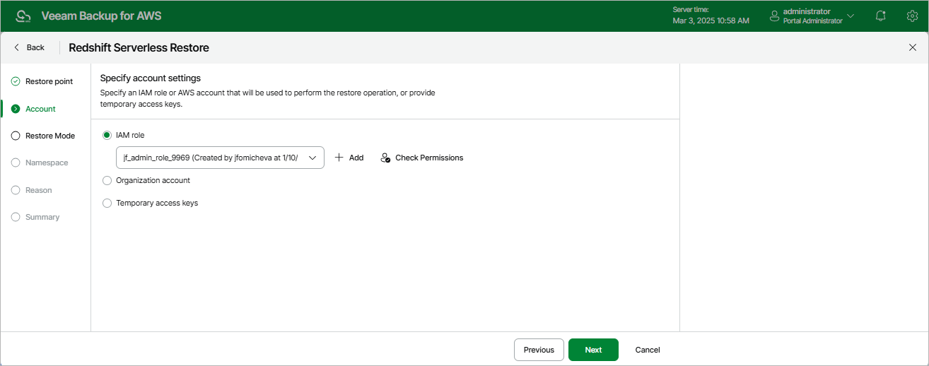 At the Account step of the wizard, choose whether you want to use an IAM role of a standalone AWS account, an AWS account of an AWS Organization, or one-time access keys of an IAM user to allow Veeam Backup & Replication to perform the restore operation. For information on the permissions that the IAM role or IAM user must have to perform the restore operation, see Redshift Serverless Restore IAM Permissions.