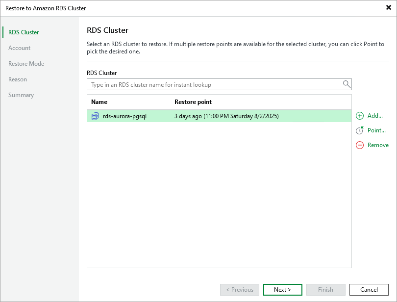 At the RDS Cluster step of the wizard, choose a restore point that will be used to restore the selected Aurora DB cluster. By default, Veeam Backup & Replication uses the most recent valid restore point. However, you can restore the cluster data to an earlier state.