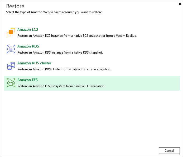 You can also launch the Restore to Amazon EFS wizard from the Home tab. To do that, click Restore and select AWS. In the Restore window, select Amazon EFS. |