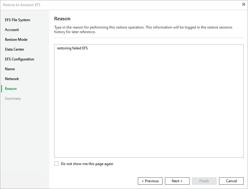 At the Reason step of the wizard, specify a reason for restoring the Amazon EFS file system. The information you provide will be saved in the session history and you can reference it later.