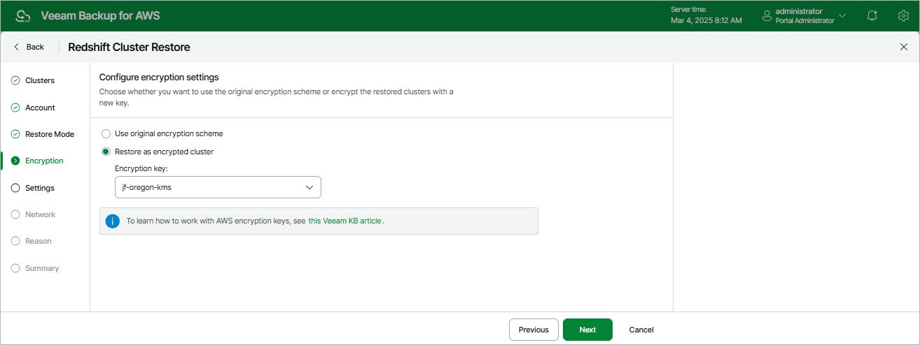 If the necessary KMS key is not displayed in the list, or if you want to use a KMS key from an AWS account other than the AWS account to which the specified IAM role belongs, you can select Add custom key ARN from the Encryption key drop-down list, and specify the Amazon resource name (ARN) of the key in the Add Custom Key ARN window. For Veeam Backup for AWS to be able to encrypt the restored cluster using the provided KMS key, either the IAM role (or user) specified for the restore operation or the IAM role used to create the restore point that was selected at step 2 of the wizard must have permissions to access the key. |
