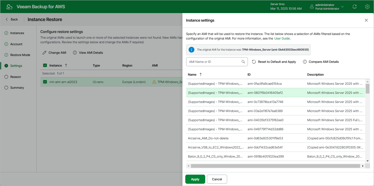 When displaying the list of available AMIs, Veeam Backup for AWS applies a number of filtering criteria (such as architecture, hypervisor, virtualization type, boot mode and so on) to avoid misconfiguration issues. If the AMI that you want to use to launch the restored EC2 instance is not displayed in the list, you can try entering its ID in the search field of the Instance settings window — in this case, Veeam Backup for AWS will return the AMI without applying any filtering criteria. |