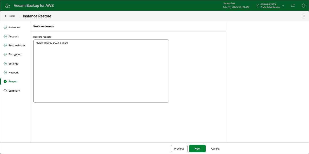 At the Reason step of the wizard, you can specify a reason for restoring the EC2 instance. This information will be saved to the session history, and you will be able to reference it later.
