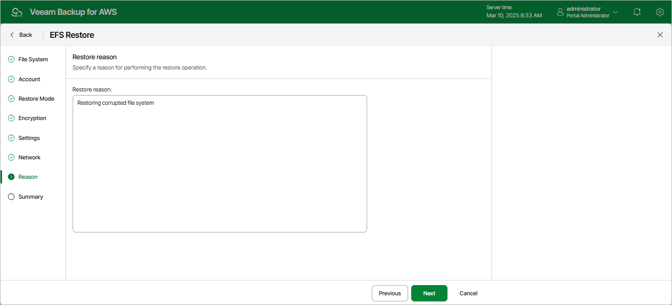 At the Reason step of the wizard, specify a reason for restoring the EFS file system. This information will be saved to the session history, and you will be able to reference it later.