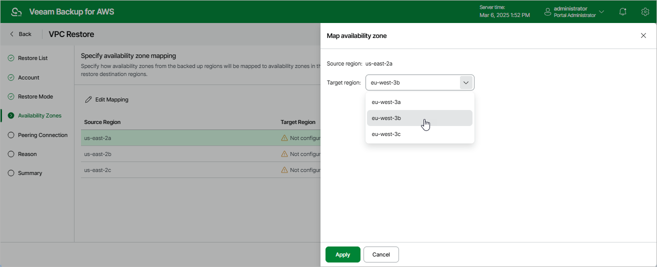 At the Availability Zones step of the wizard, for each source Availability Zone, choose an Availability Zone in the target AWS Region to which VPC configuration items of the source Availability Zone will be restored: