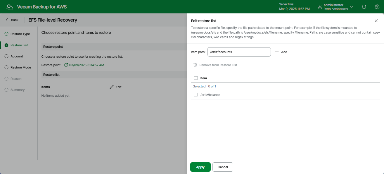 - For each file or folder you want to recover, specify a path in the Item path field and click Add. Note that you cannot add more than 5 paths.
