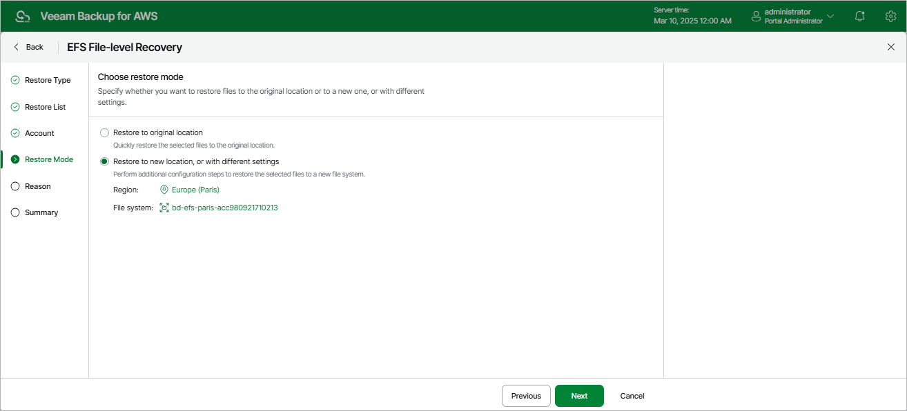 At the Restore Mode step of the wizard, choose whether you want to restore files and folders to the original or to a custom location. If you select the Restore to new location, or with different settings option, specify the target AWS Region and the file system to which the files and folders will be restored.
