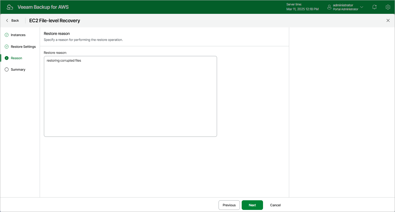 At the Reason step of the wizard, you can specify a reason for recovering files and folders. This information will be saved to the session history and you will be able to reference it later.