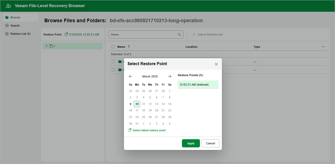 By default, Veeam Backup for AWS uses the most recent valid restore point. However, you can restore files and folders to an earlier state.