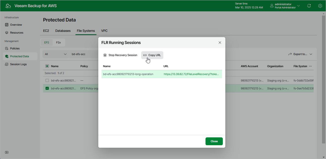 If you accidentally close the FLR Running Sessions window, navigate to Protected Data > File Systems > EFS and click the link in the File-Level Recovery URL column to open the window again. |