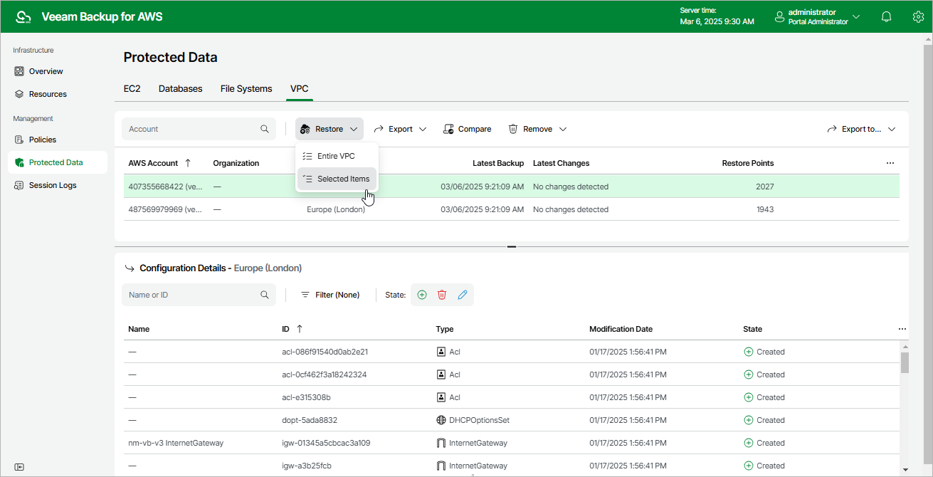 This is an archive version of the document. To get the most up-to-date information, see the current version. Step 1. Launch VPC Restore Wizard To launch the VPC Restore wizard, do the following:Navigate to Protected Data > VPC.Select the configuration record for an AWS Region whose VPC configuration you want to restore.Click Restore > Selected Items.