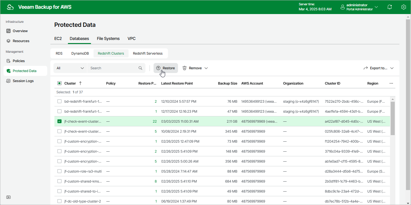 - Select the Redshift cluster that you want to restore.