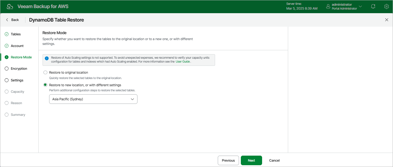 Veeam Backup for AWS does not support restoring of provisioned throughput capacity values adjusted by Amazon DynamoDB auto scaling for tables and global secondary indexes (GSI). This means that if you add to the restore session a table with auto scaling enabled or a GSI-associated table with auto scaling enabled, the restore mode will affect the number of capacity units provisioned to the restored table or to the GSI: