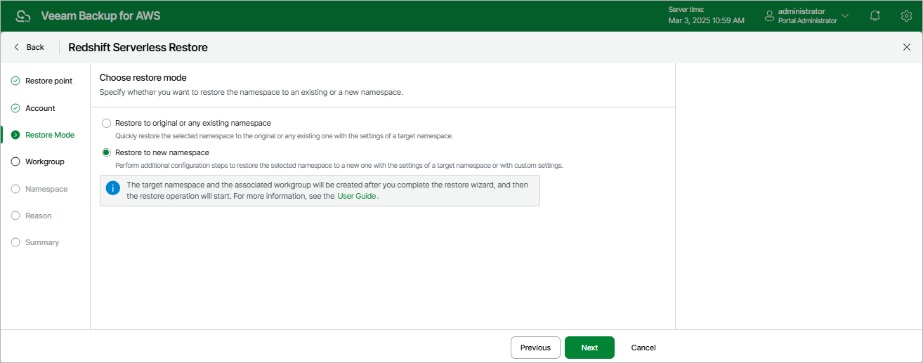 If you select the Restore to new namespace option, you will need to perform additional configuration actions at step 5 and step 6 to create the target namespace and a workgroup associated with it. The target namespace and the new workgroup will be added to the AWS infrastructure only after you complete the restore wizard, and then the restore operation will start.