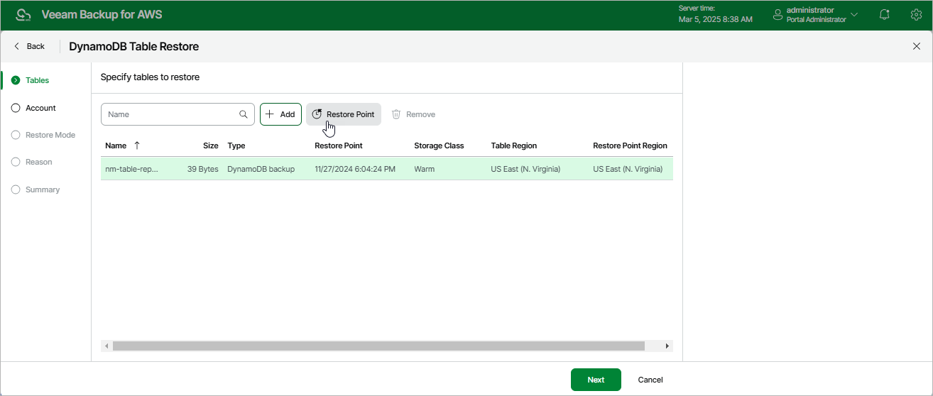 At the Tables step of the wizard, you can add DynamoDB tables to the restore session and select restore points to be used to perform the restore operation for each added table. By default, Veeam Backup for AWS uses the most recent valid restore point. However, you can restore a table to an earlier state.