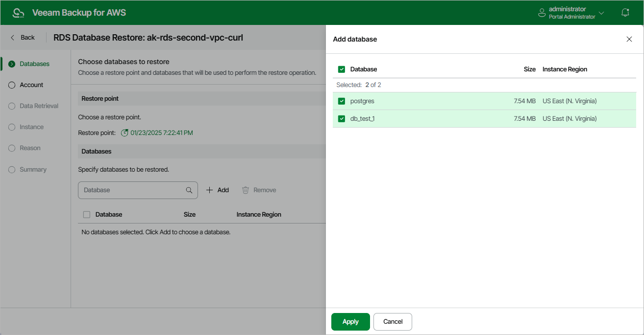 At the Databases step of the wizard, you can add databases to the restore session and select a restore point that will be used to perform the restore operation for each database. By default, Veeam Backup for AWS uses the most recent valid restore point. However, you can restore the database data to an earlier state.