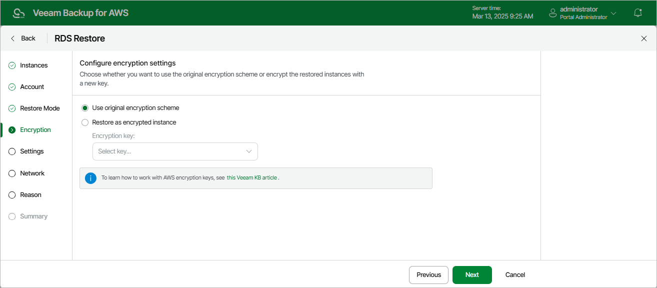 For a KMS key to be displayed in the list of available encryption keys, it must be stored in the AWS Region selected at step 4 of the wizard and the IAM role or user specified for the restore operation at step 3 of the wizard must have permissions to access the key. For more information on KMS keys, see AWS Documentation.