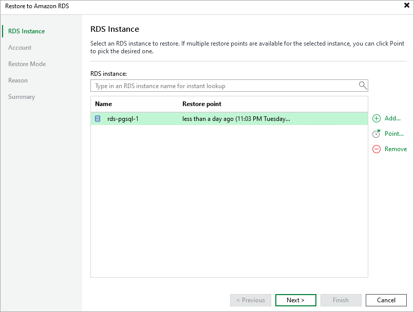 At the RDS Instance step of the wizard, choose a restore point that will be used to restore the selected DB instance. By default, Veeam Backup & Replication uses the most recent valid restore point. However, you can restore the instance data to an earlier state.