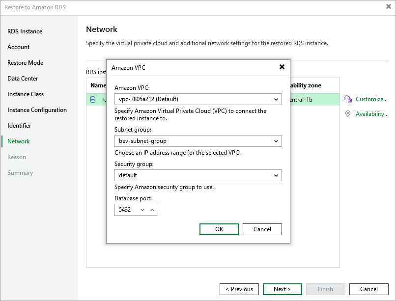 At the Network step of the wizard, you can configure specific network settings for the restored DB instance. To do that, select the instance and do the following: