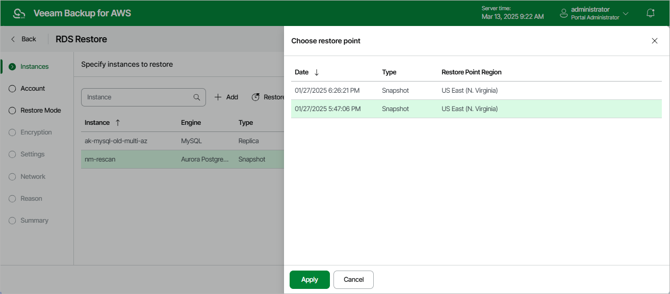 At the Instances step of the wizard, you can add DB instances and Aurora DB clusters to the restore session and select restore points to be used to perform restore for each added RDS resource. By default, Veeam Backup for AWS uses the most recent valid restore point. However, you can restore an RDS resource to an earlier state.