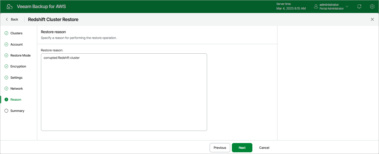At the Reason step of the wizard, you can specify a reason for restoring the Redshift cluster. This information will be saved to the session history, and you will be able to reference it later.