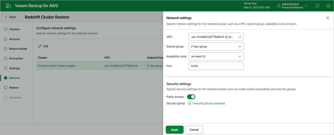 At the Network step of the wizard, configure network and security settings for the restored Redshift cluster. To do that, select the necessary cluster and click Edit. In the opened window, do the following: