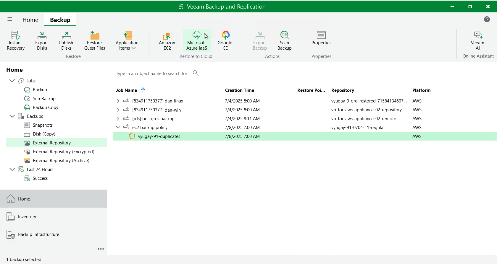 - Expand the backup policy that protects an EC2 instance that you want to restore, select the necessary instance and click Microsoft Azure Iaas on the ribbon.