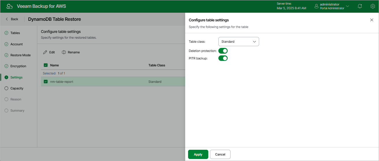 By default, the AWS Backup service restores tables with the Standard table class only. To restore a table with the Standard-IA table class, Veeam Backup for AWS updates the table class of the restored table. Keep in mind that you can change table classes no more than two times during a 30-day period. For more information on considerations and limitations when choosing a table class, see AWS Documentation. |