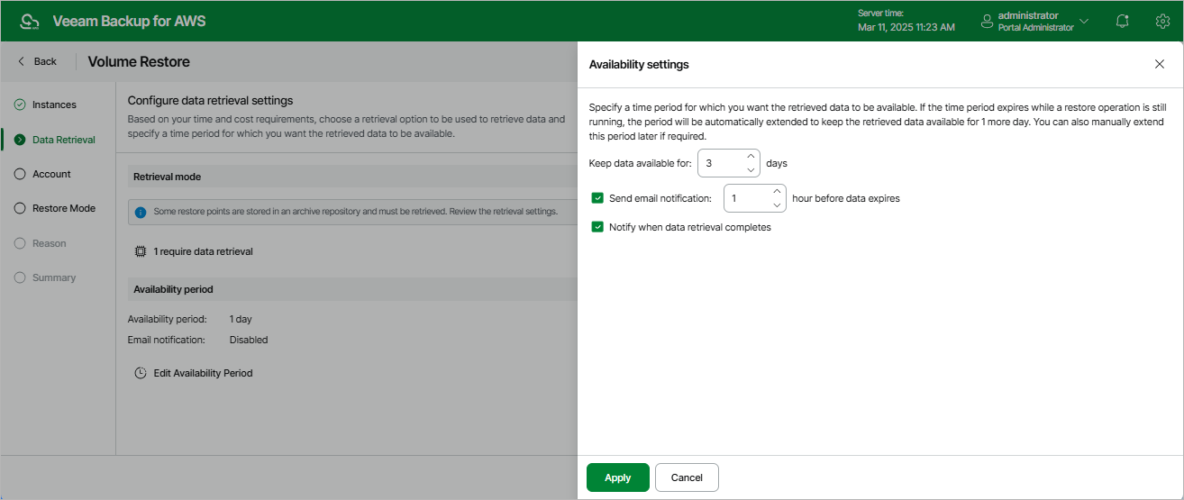 1. In the Availability settings window, specify the number of days for which you want to keep the data available for restore operations. If the time period expires while a restore operation is still running, Veeam Backup for AWS automatically extends the period to keep the retrieved data available for 1 more day. You can also manually extend the availability period later if required.